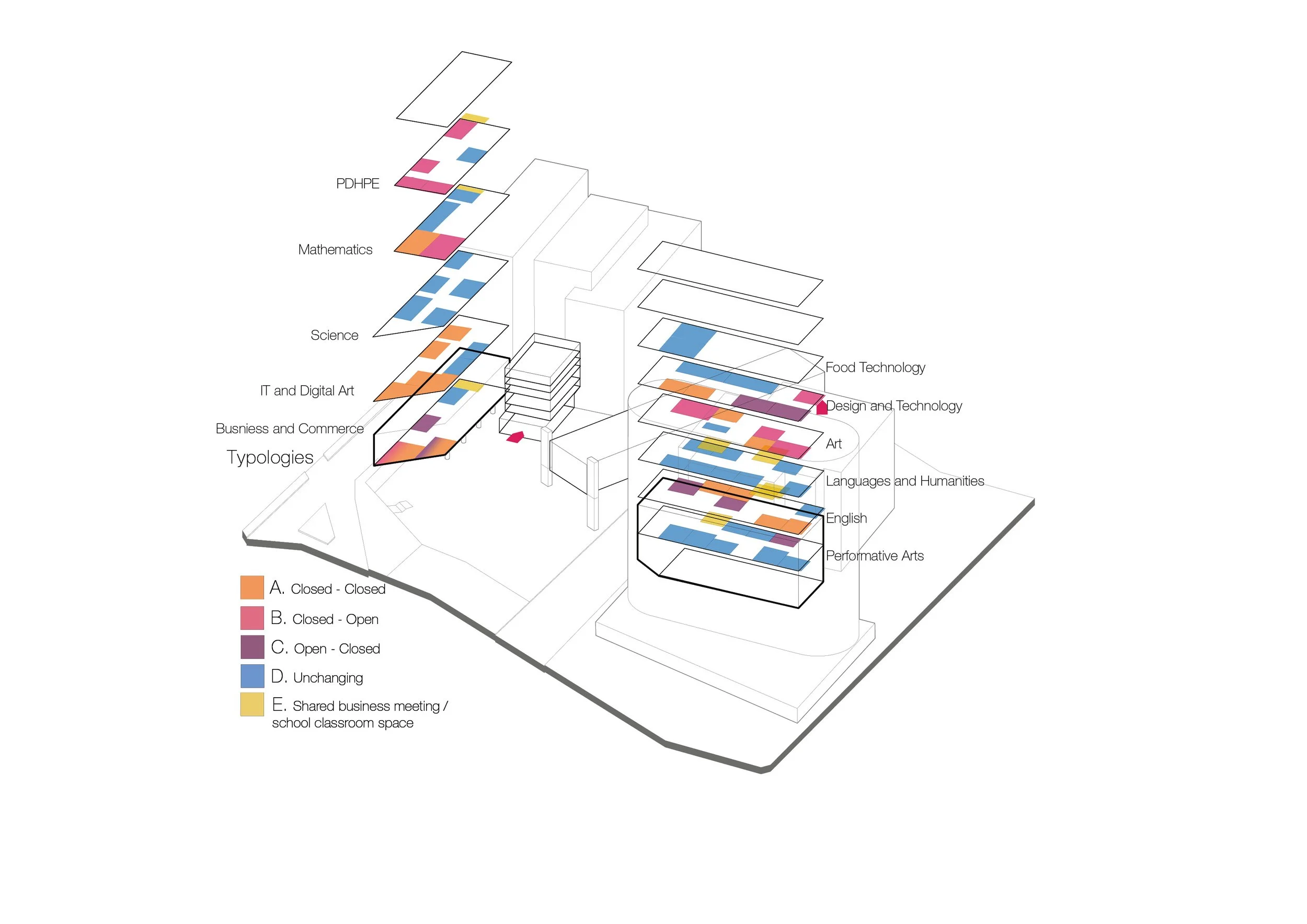 Throughout the project I heavily researched education design standards and the evolving nature of teaching and learning. I took special interest in space efficiencies and discovering which school subjects share space with a mutually beneficial outcome.