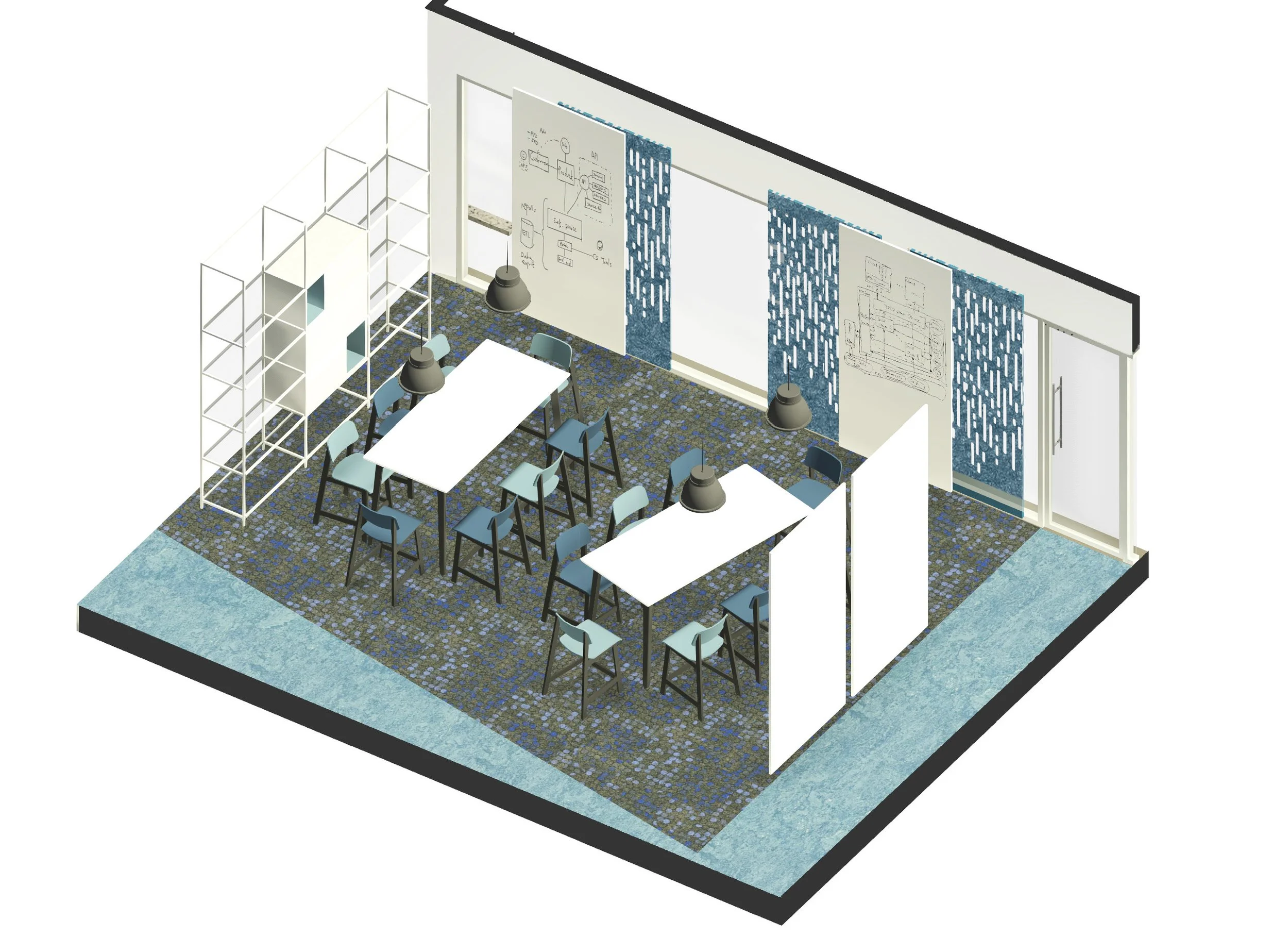 The adjacent visuals are examples of breakout spaces. These spaces are located along the main corridor to be easily accessible and to promote open collaboration. These spaces are designed to feel like the side alleys of Barcelona, areas of discovery and intimacy.