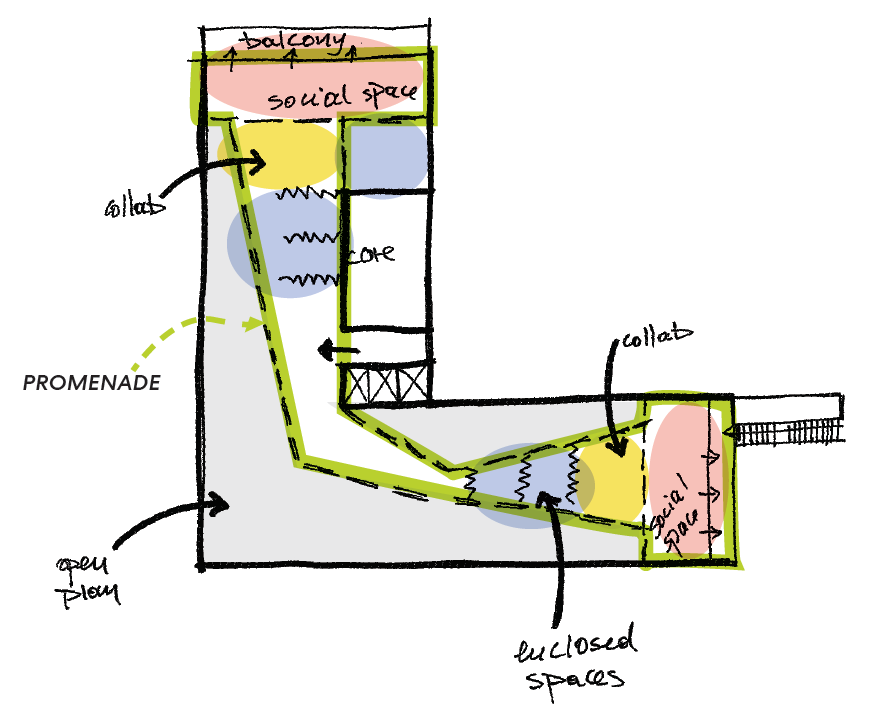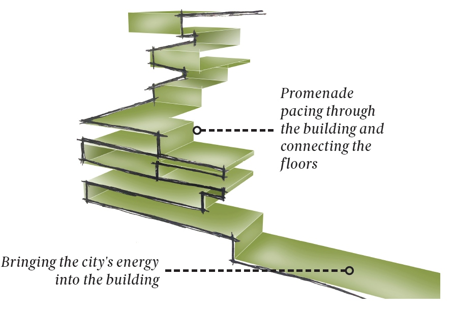 Further above is the concept sketch (in green), and directly above is my initial sketch of the feature ceiling for the working floors.