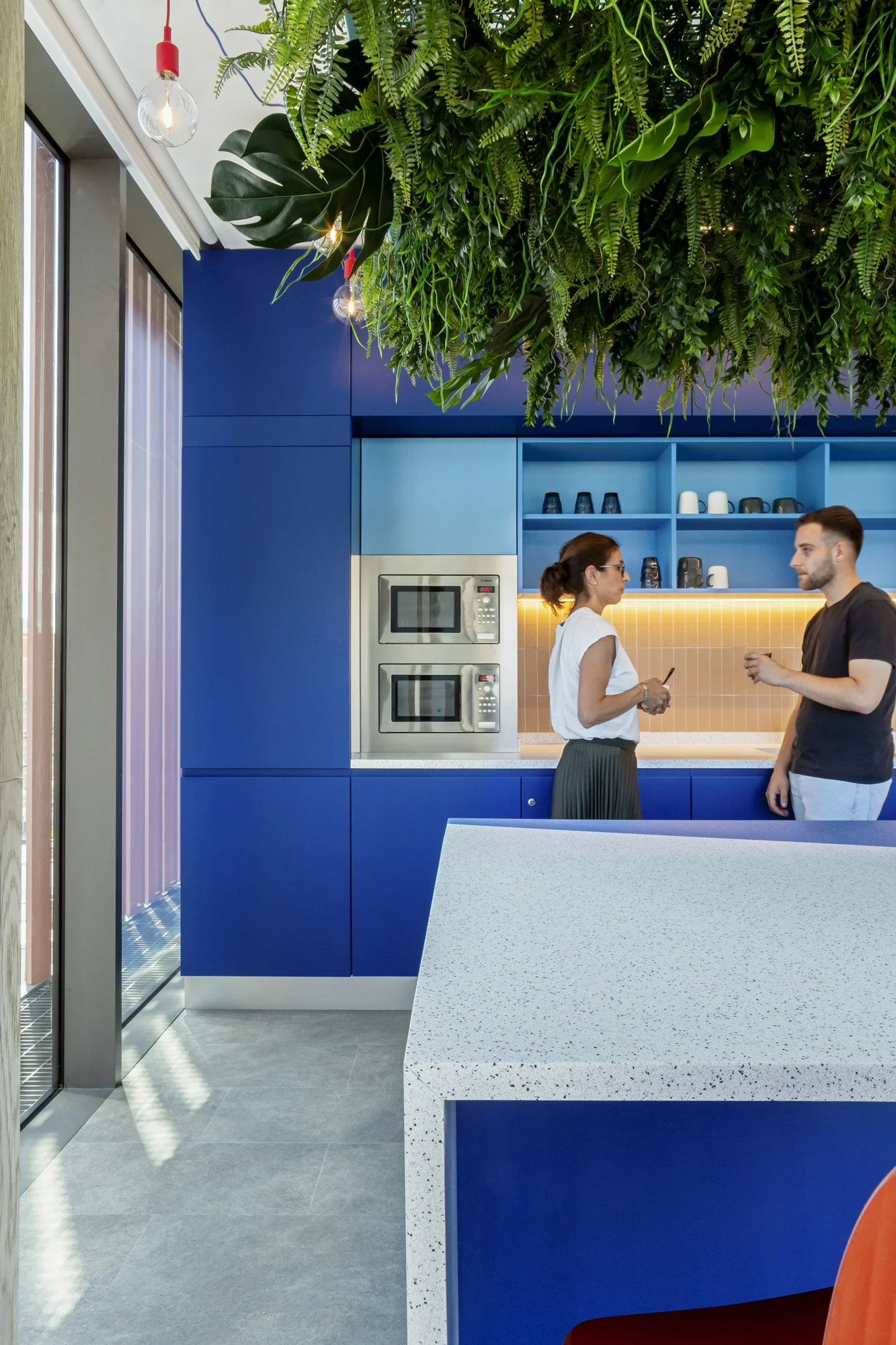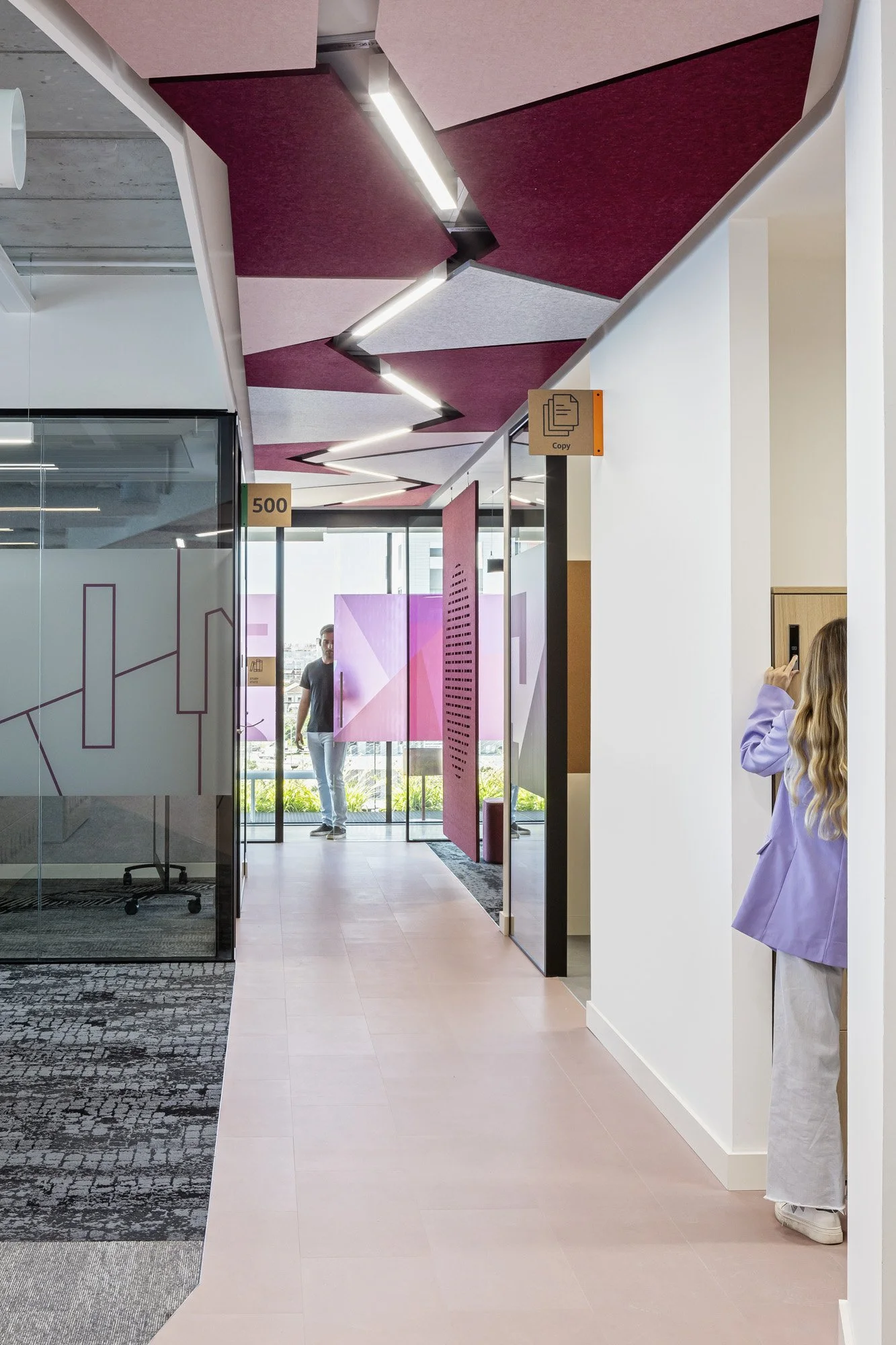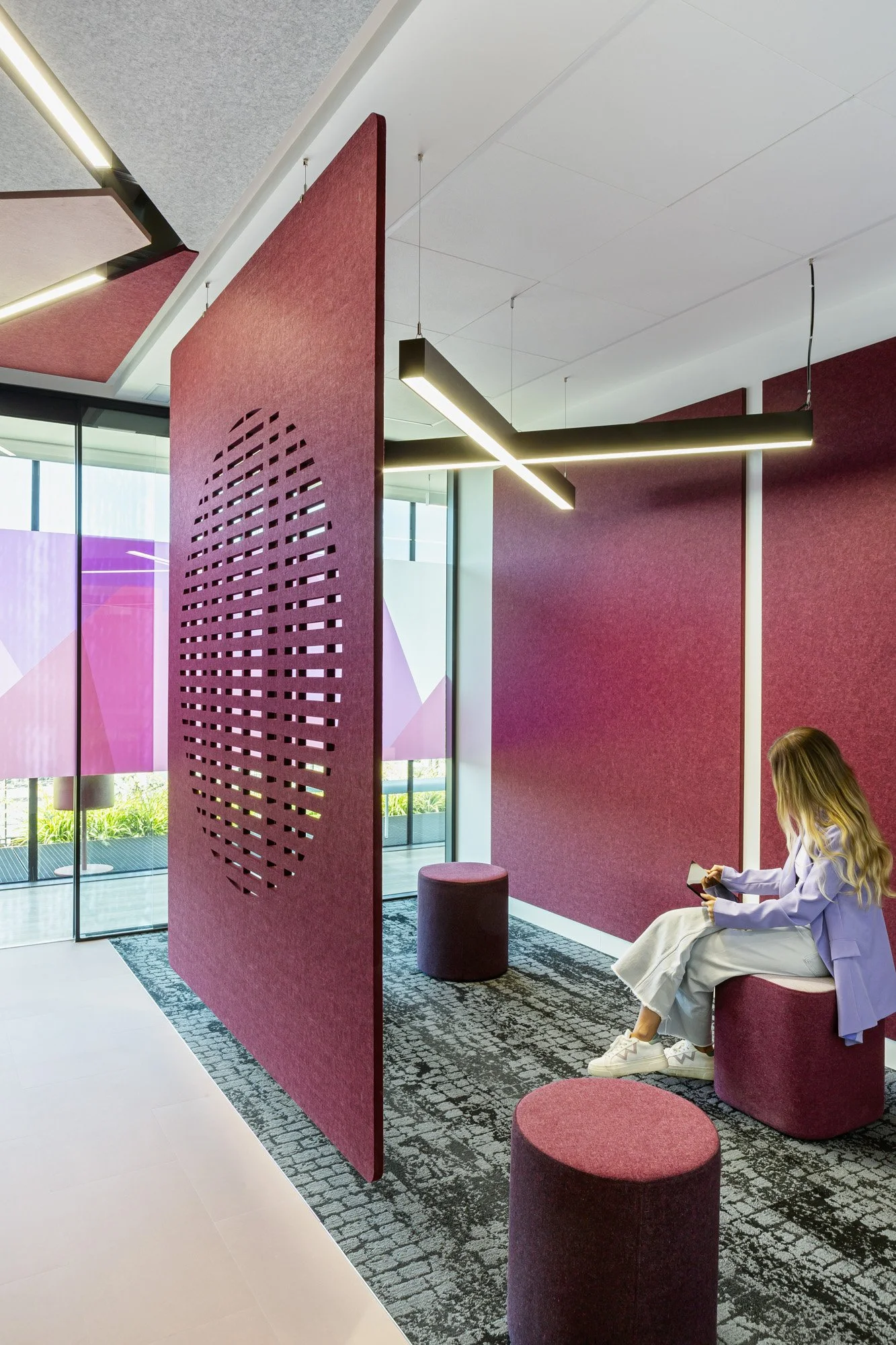 This breakout corner / scrum space uses layering to create a hidden feature. From a straight on view the blue wall looks completely homogenous, however as the users move around the space the cut outs are uncovered.